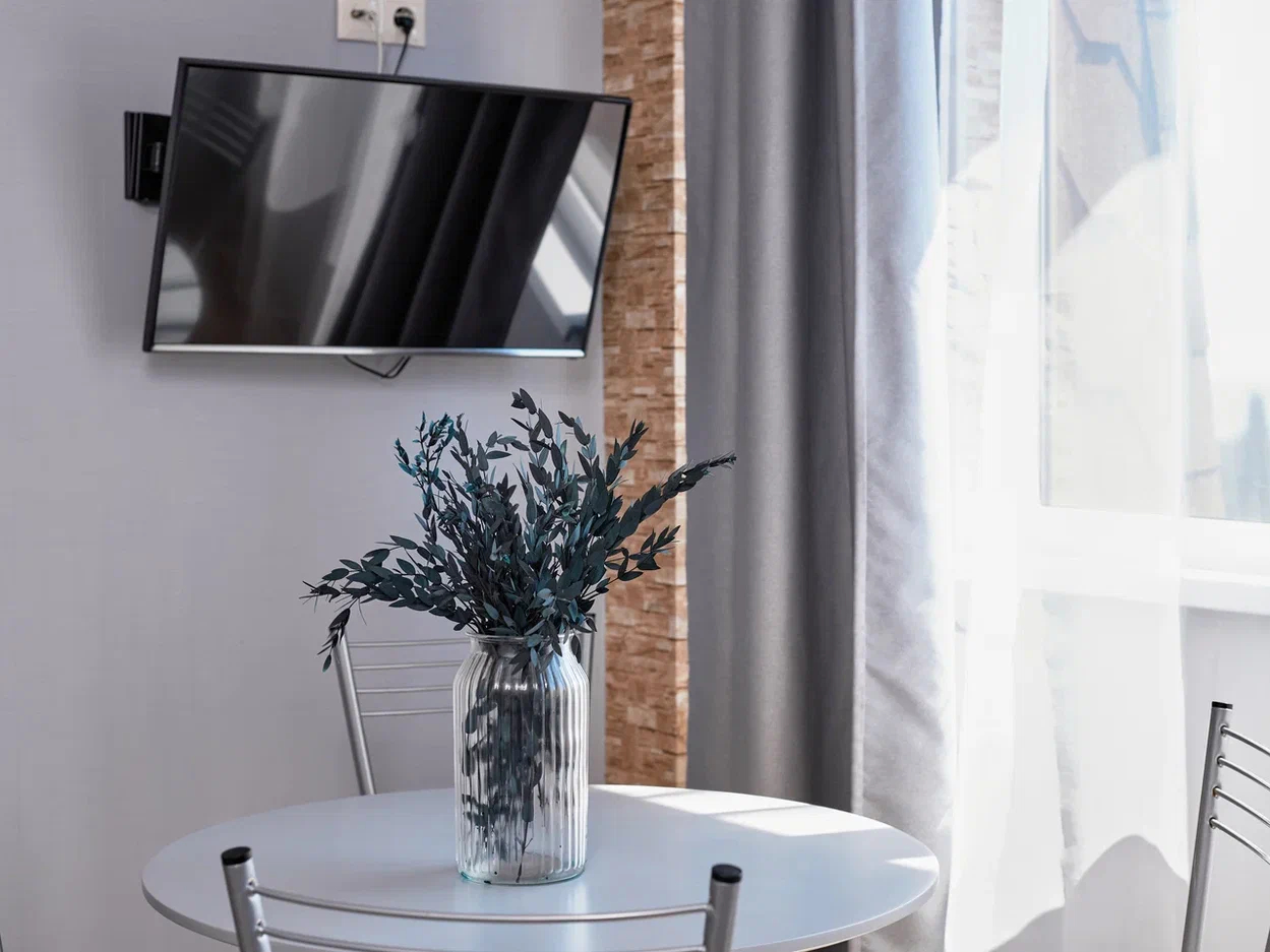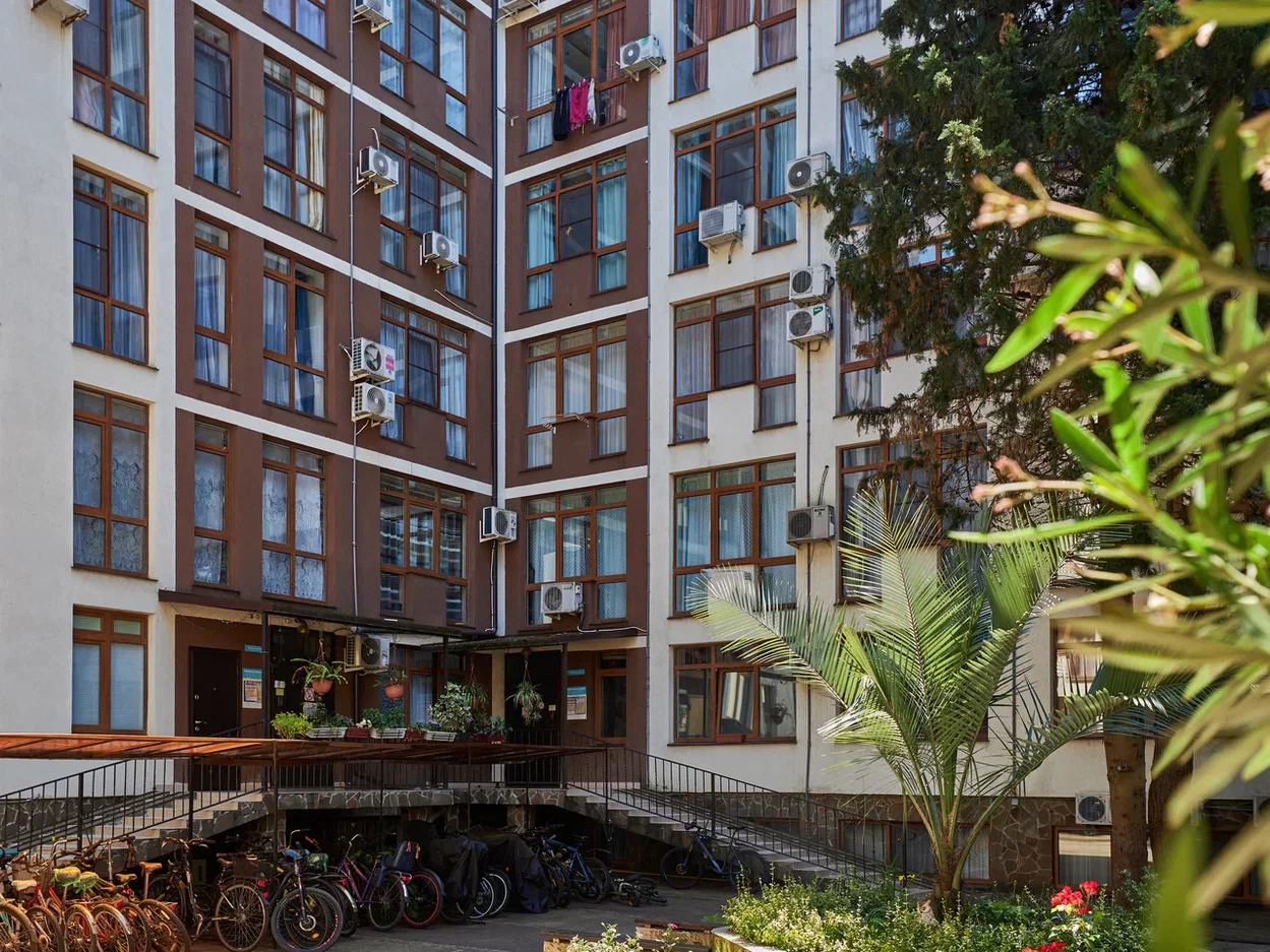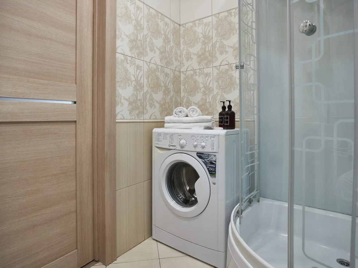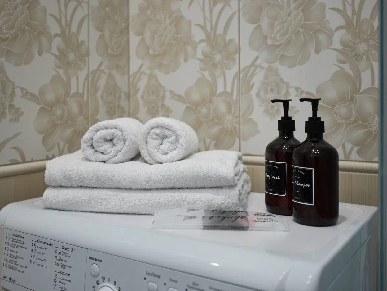 - Оборудование: гладильная доска, кондиционер, набор посуды, стиральная машина, сушилка для белья, телевизор, утюг, холодильник